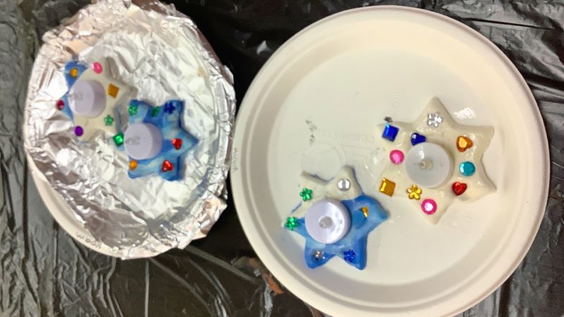 Materials needed: Air Magic dough, Jewish star cookie cutters, colorful gems, Mod Podge, flameless tea candles